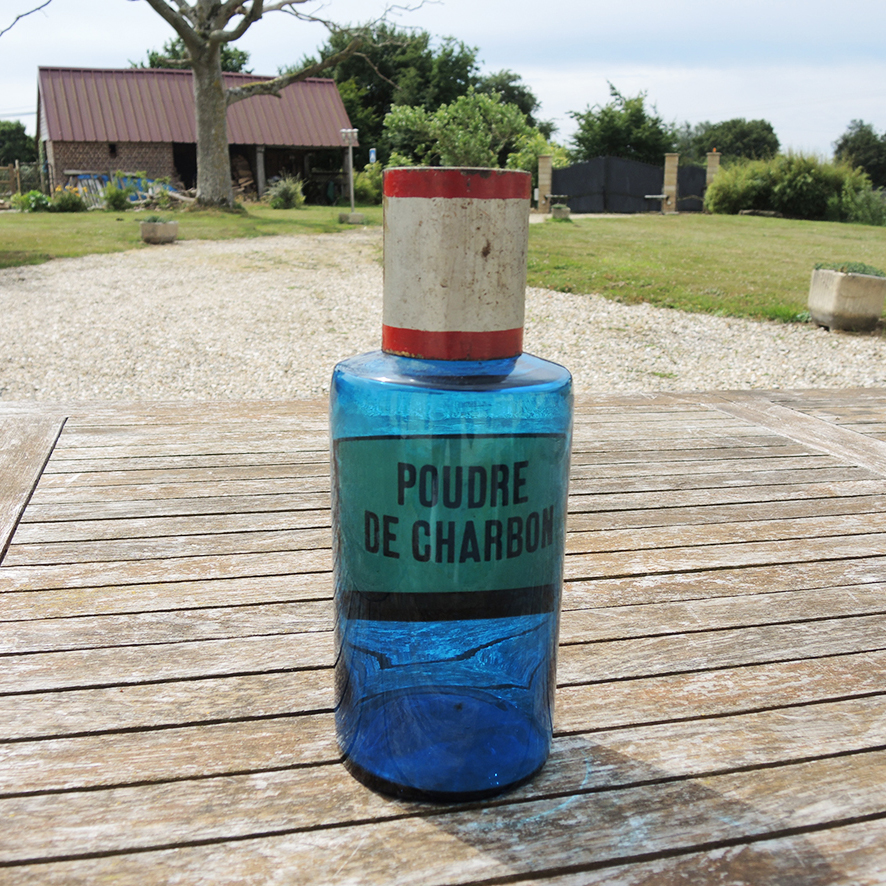 Ancien Pot Apothicaire en Verre Bleu – Poudre de Charbon