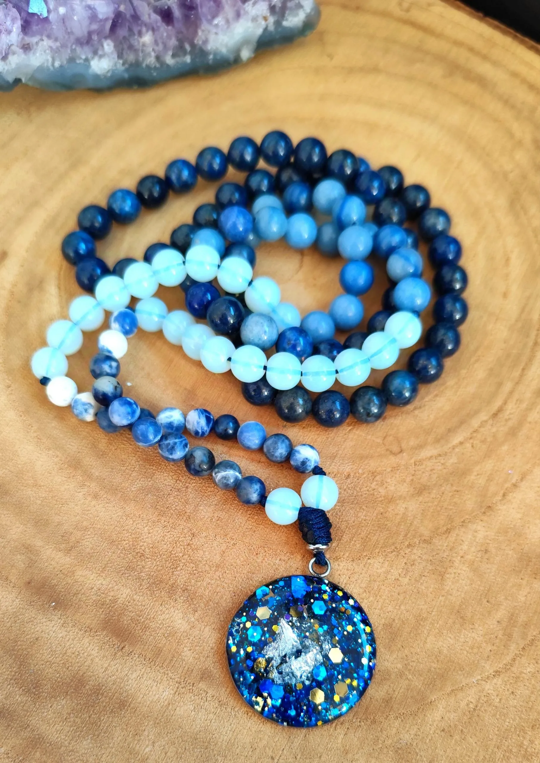 Mala 108 Perles Lithothérapie – Sodalite, Opalite, Aventurine Bleue & Lapis-lazuli | Maxi Galaxie « Médiumnité » (Chakra 3ème œil) | Argenté