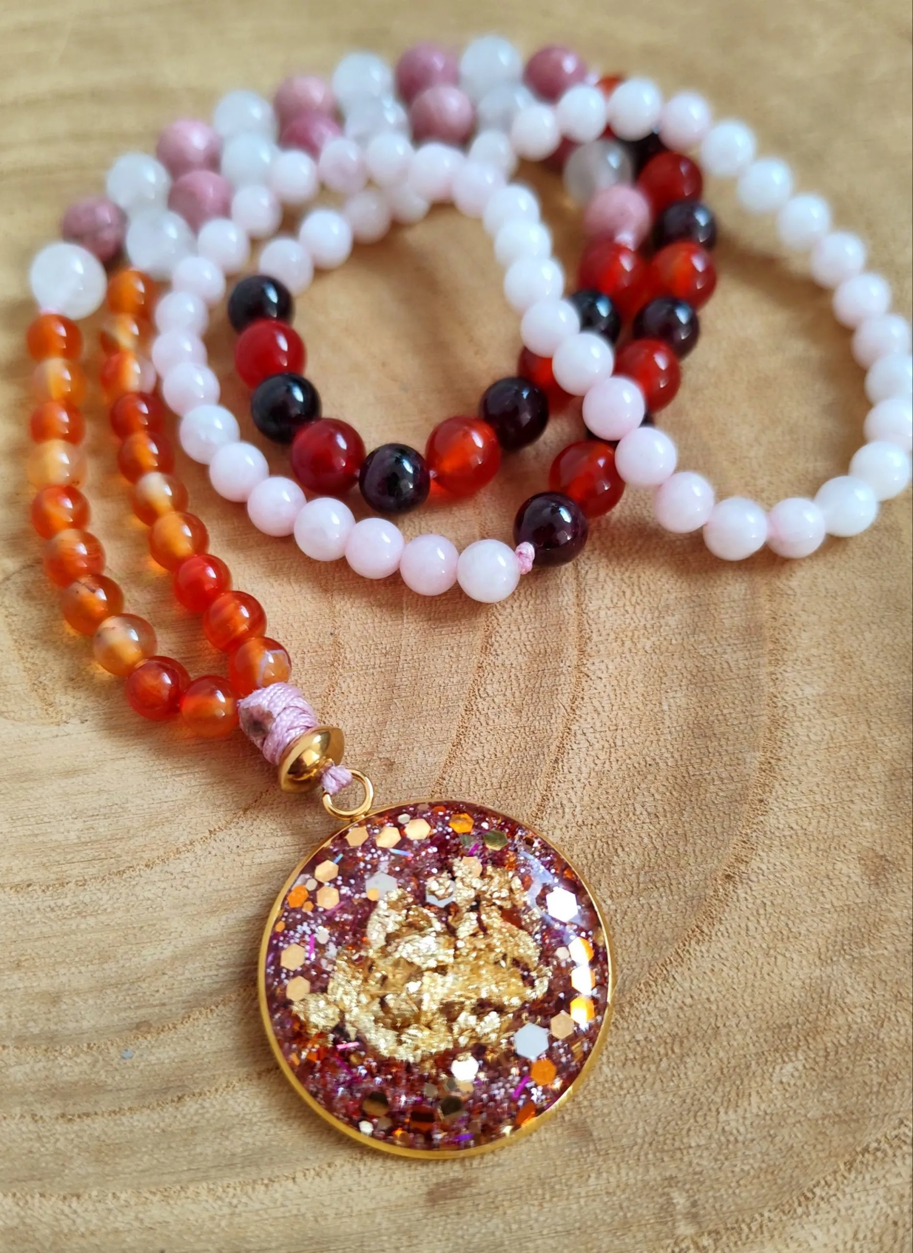 Mala 108 perles Enfant Intérieur en Cornaline, Grenat, Quartz Rose et Rhodonite + Maxi Galaxie Enfant Intérieur | doré