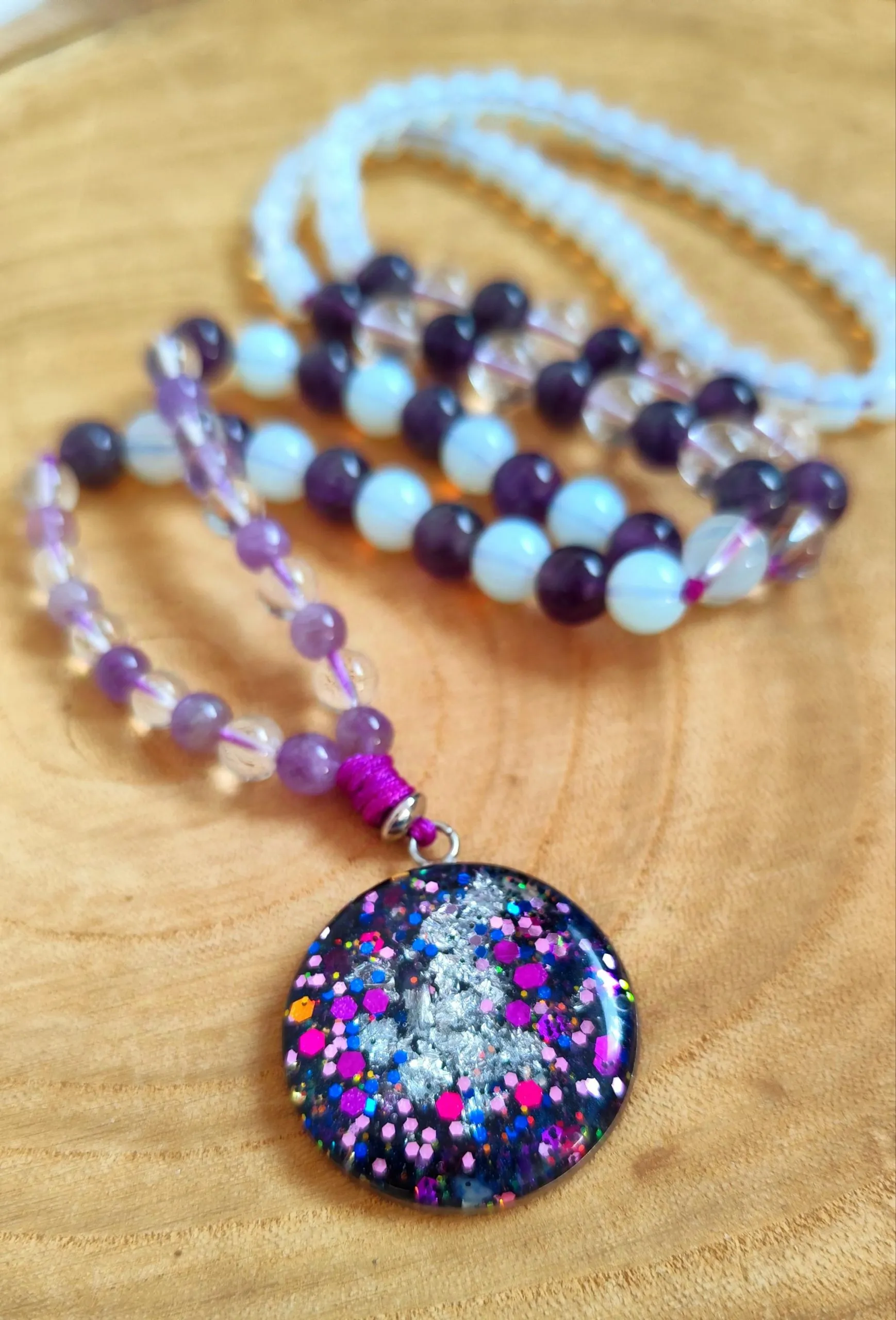 Mala 108 perles Inspiration & Connexion en Opalite, Cristal de Roche et Améthyste + Maxi Galaxie Inspiration et Connexion Chakra Coronal | Argenté