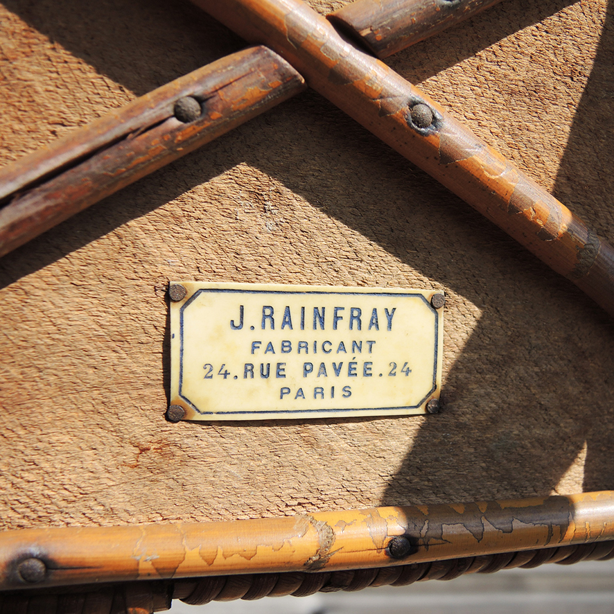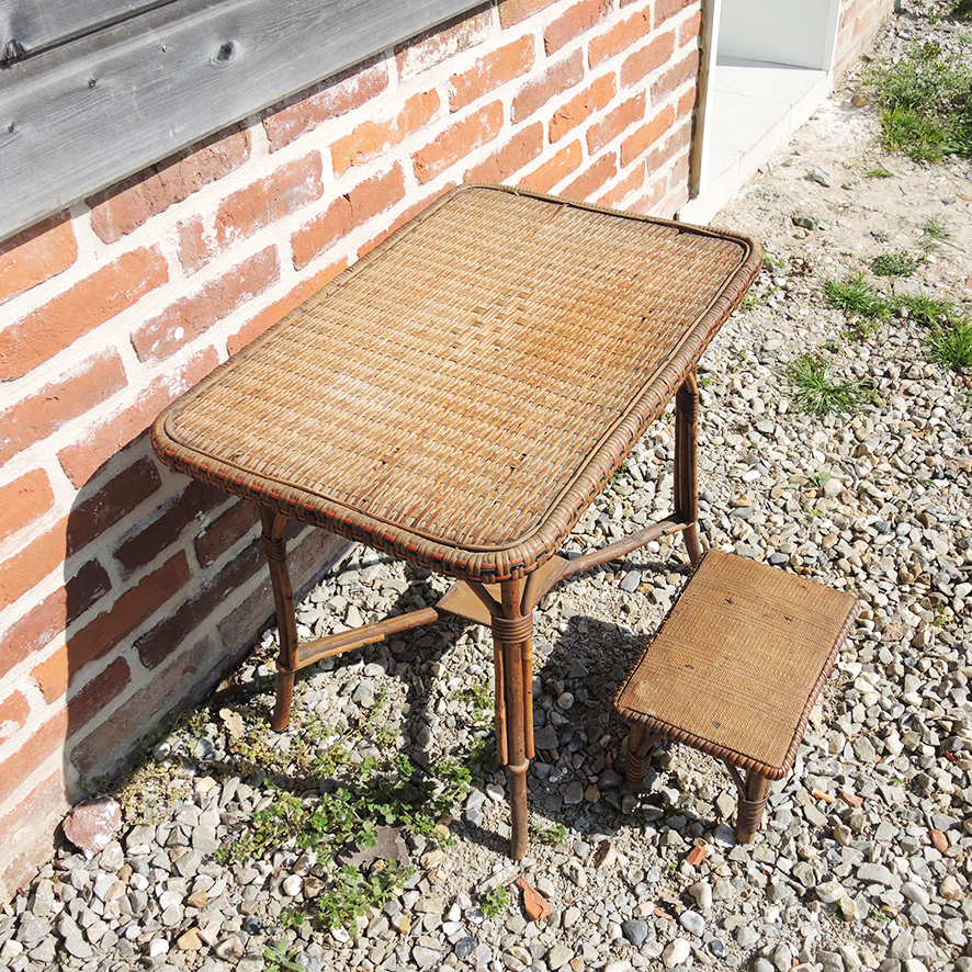 une petite table avec une structure en rotin et un plateau en osier tressé ‘gansé’ d’orange et de noir, sur le dessous on retrouve la plaque du fabricant :