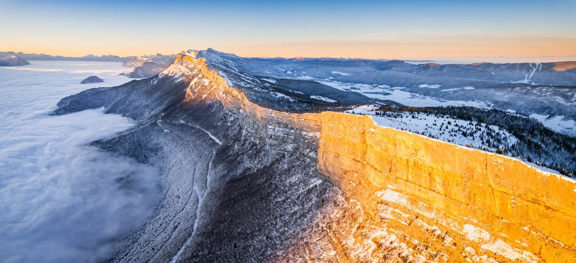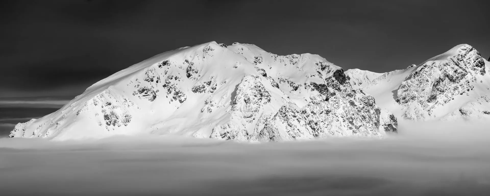Portrait serré de ce magnifique sommet qu’est la Roche de la Muzelle, dans le massif des Écrins. Ici le sommet est baigné par les derniers rayons du soleil alors que plus bas, l’obscurité à déjà gagner ses pentes raides.