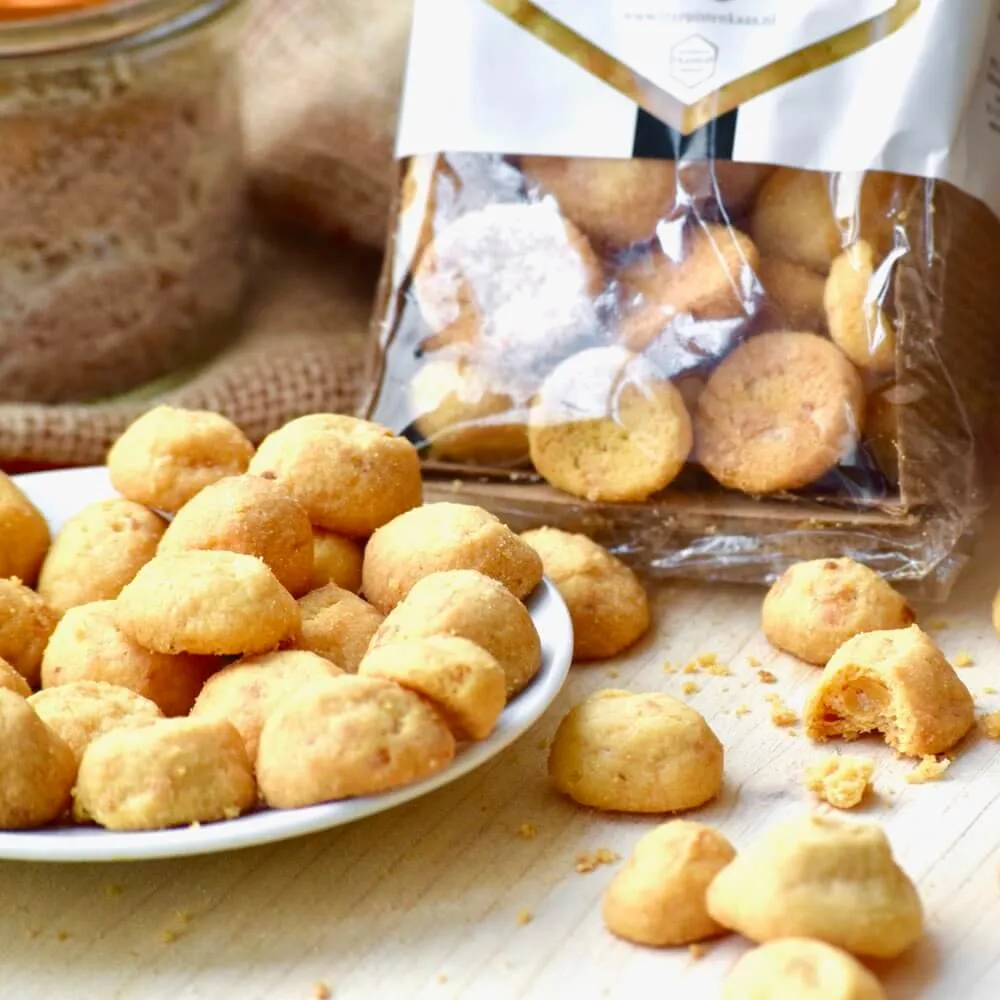Ingrédients : Farine de blé, beurre, 30% fromage La Trappe Quadrupel, lait en poudre, sel de mer, oeuf, poudre d’oignon, pâte de tomate, levure, poivre