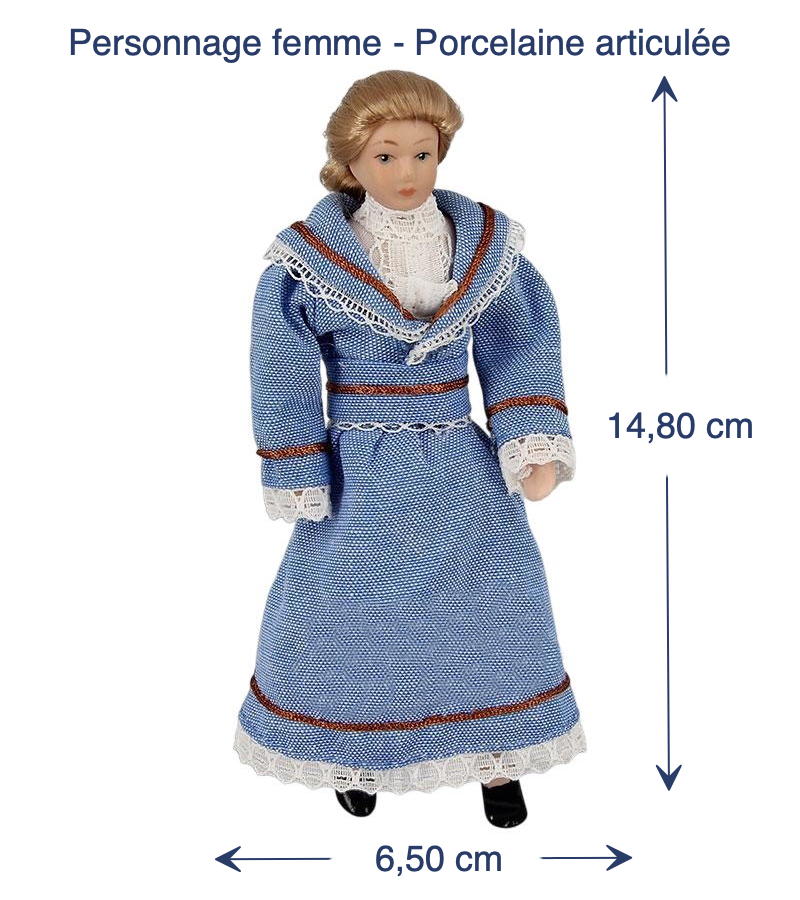 Ce personnage féminin en porcelaine incarne l’élégance intemporelle et le raffinement des époques passées. Son allure distinguée, mise en valeur par une robe bleu ciel agrémentée de dentelle et de détails soignés, en fait une pièce incontournable pour une maison de poupée miniature. Articulée aux bras, aux coudes et aux genoux, ce personnage femme élégante permet de recréer des scènes vivantes et réalistes.