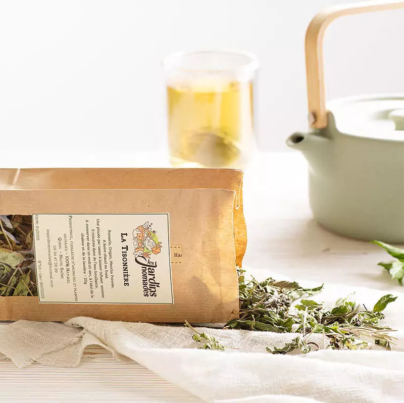 Les plantes de cette infusion sont cueillies à la main aux alentour de l’atelier et au jardin.