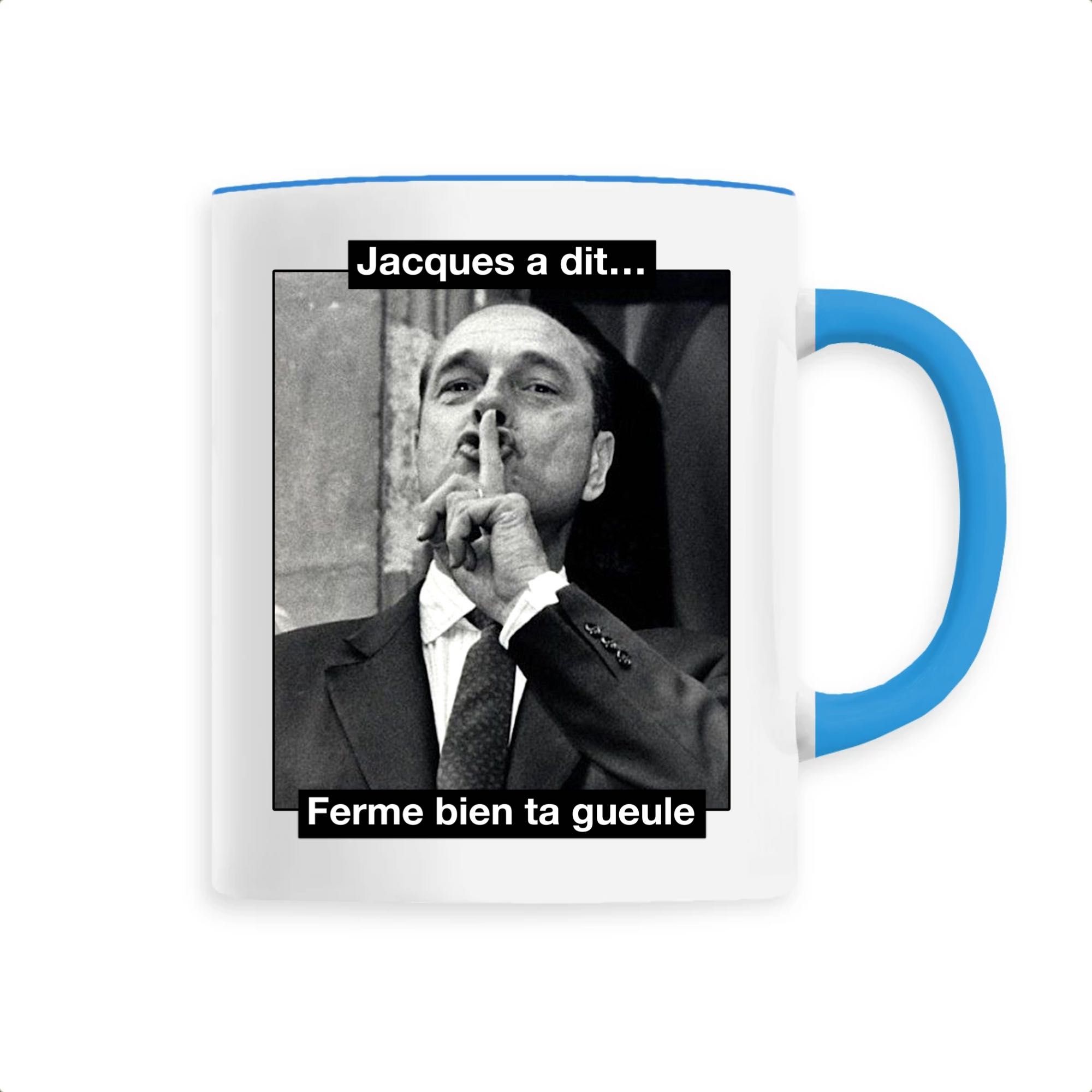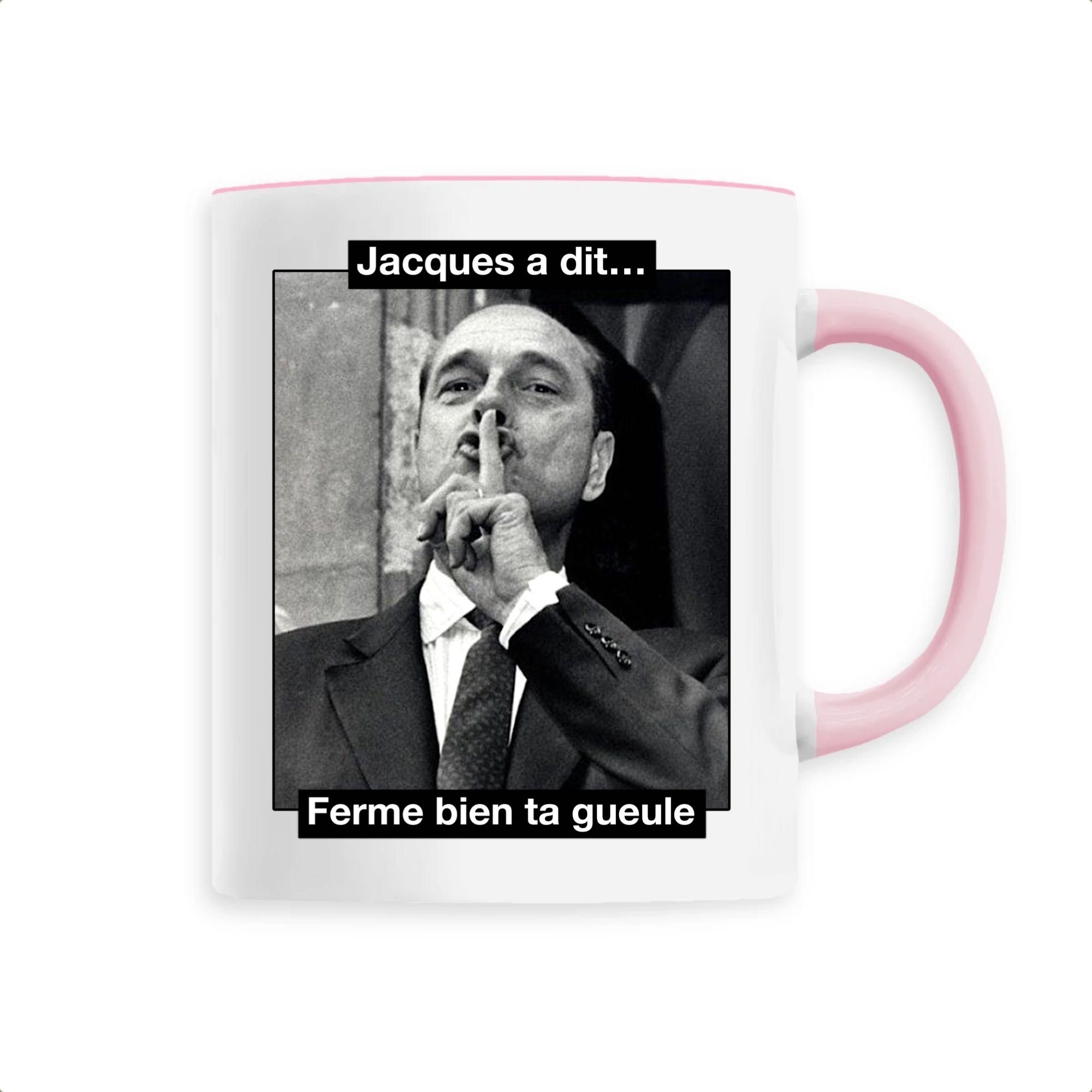 Mug original et décalé avec une célèbre photo de Chirac qui demande de se taire… Nous avons ajouté un petit coté fun et humoristique avec la phrase « Jacques a dit, ferme bien ta gueule« . C’est assez violent mais très efficace! Ce mug Chirac conviendra parfaitement pour un cadeau original, ou pour se faire plaisir et faire rire notre entourage! Efficacité garantie 🙂