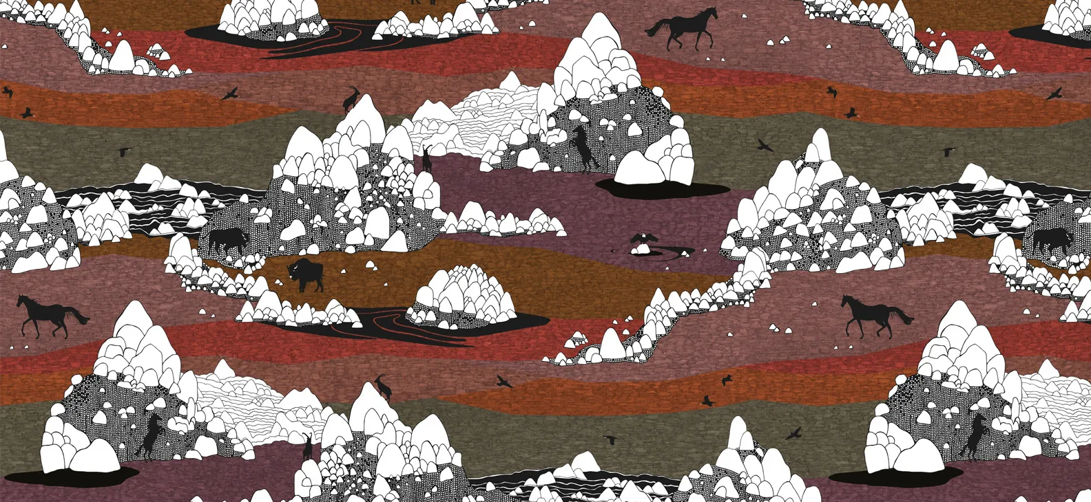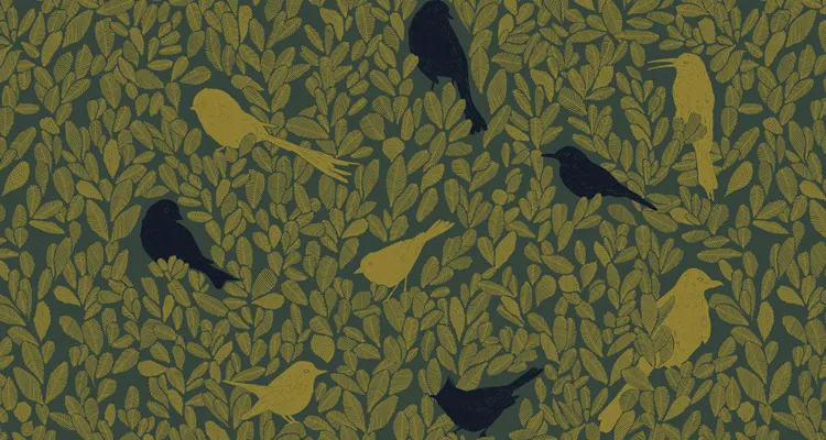 Motif ornemental à la fois présent et discret, Paradis Caché présente une nature chantante et surprenante où les oiseaux se dessinent dans un feuillage protecteur qui s’anime grâce aux vibrations du dessin fait main.