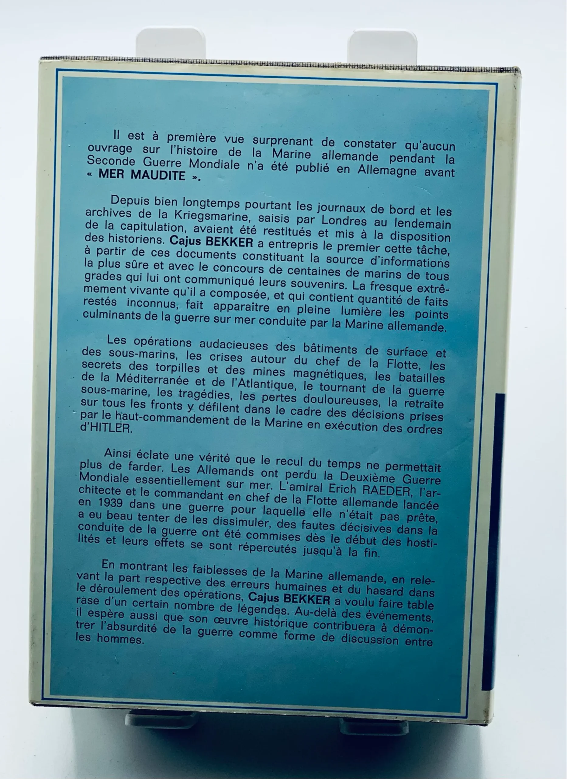 Il est à première vue surprenant de constater qu’aucun ouvrage sur l’histoire de la Marine allemande pendant la Seconde Guerre Mondiale n’a été publié en Allemagne avant « MER MAUDITE ». Depuis bien longtemps pourtant les journaux de bord et les archives de la Kriegsmarine, saisis par Londres au lendemain de la capitulation, avaient été restitués et mis à la disposition des historiens. Cajus BEKKER a entrepris le premier cette tâche, à partir de ces documents constituant la source d’informations la plus sûre et avec le concours de centaines de marins de tous grades qui lui ont communiqué leurs souvenirs. La fresque extrêmement vivante qu’il a composée, et qui contient quantité de faits restés inconnus, fait apparaître en pleine lumière les points culminants de la guerre sur mer conduite par la Marine allemande. Les opérations audacieuses des bâtiments de surface et des sous-marins, les crises autour du chef de la Flotte, les secrets des torpilles et des mines magnétiques, les batailles de la Méditerranée et de l’Atlantique, le tournant de la guerre sous-marine, les tragédies, les pertes douloureuses, la retraite sur tous les fronts y défilent dans le cadre des décisions prises par le haut-commandement de la Marine en exécution des ordres d’HITLER. Ainsi éclate une vérité que le recul du temps ne permettait plus de farder. Les Allemands ont perdu la Deuxième Guerre Mondiale essentiellement sur mer. L’amiral Erich RAEDER, l’architecte et le commandant en chef de la Flotte allemande lancée en 1939 dans une guerre pour laquelle elle n’était pas prête, a eu beau tenter de les dissimuler, des fautes décisives dans la conduite de la guerre ont été commises dès le début des hostilités et leurs effets se sont répercutés jusqu’à la fin. En montrant les faiblesses de la Marine allemande, en relevant la part respective des erreurs humaines et du hasard dans le déroulement des opérations, Cajus BEKKER a voulu faire table rase d’un certain nombre de légendes.