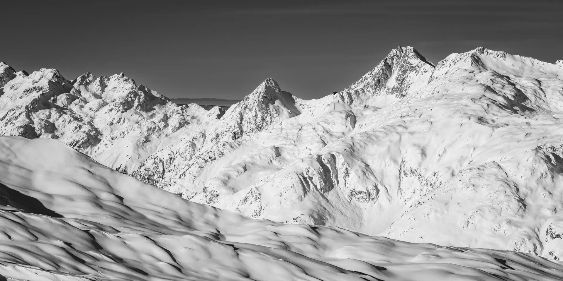 Le point culminant de la chaine de Belledonne, le Grand Pic de Belledonne, mis en avant dans une composition en noir et blanc au cœur de l’hiver.