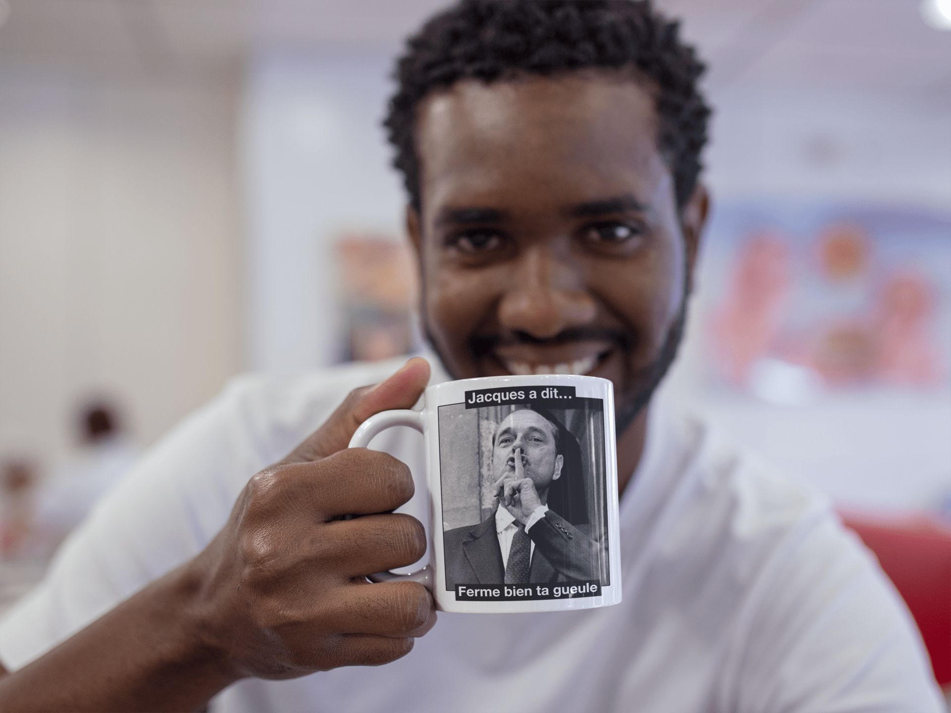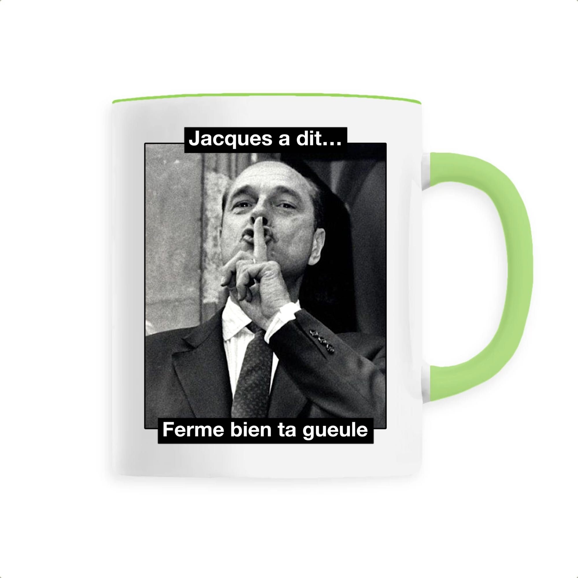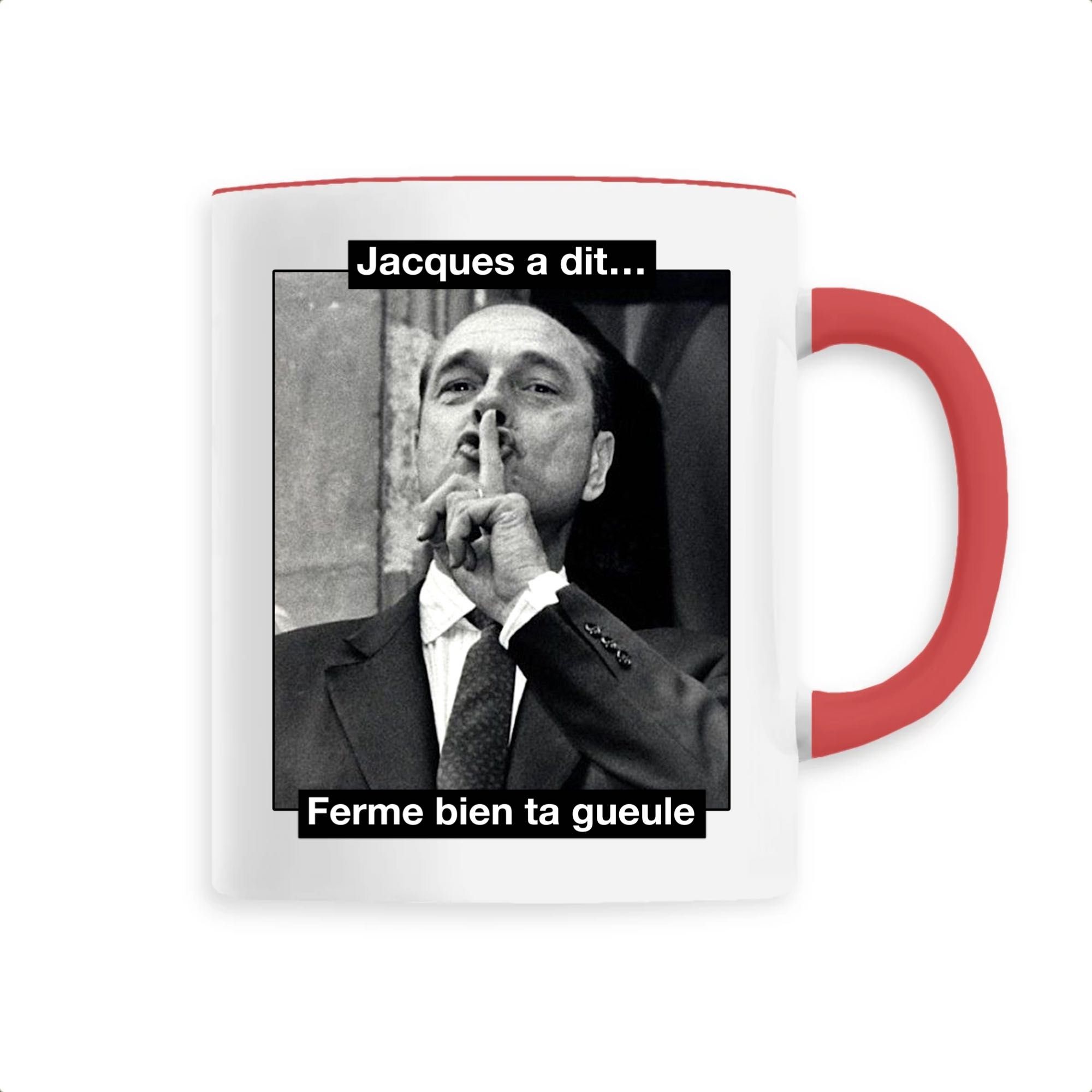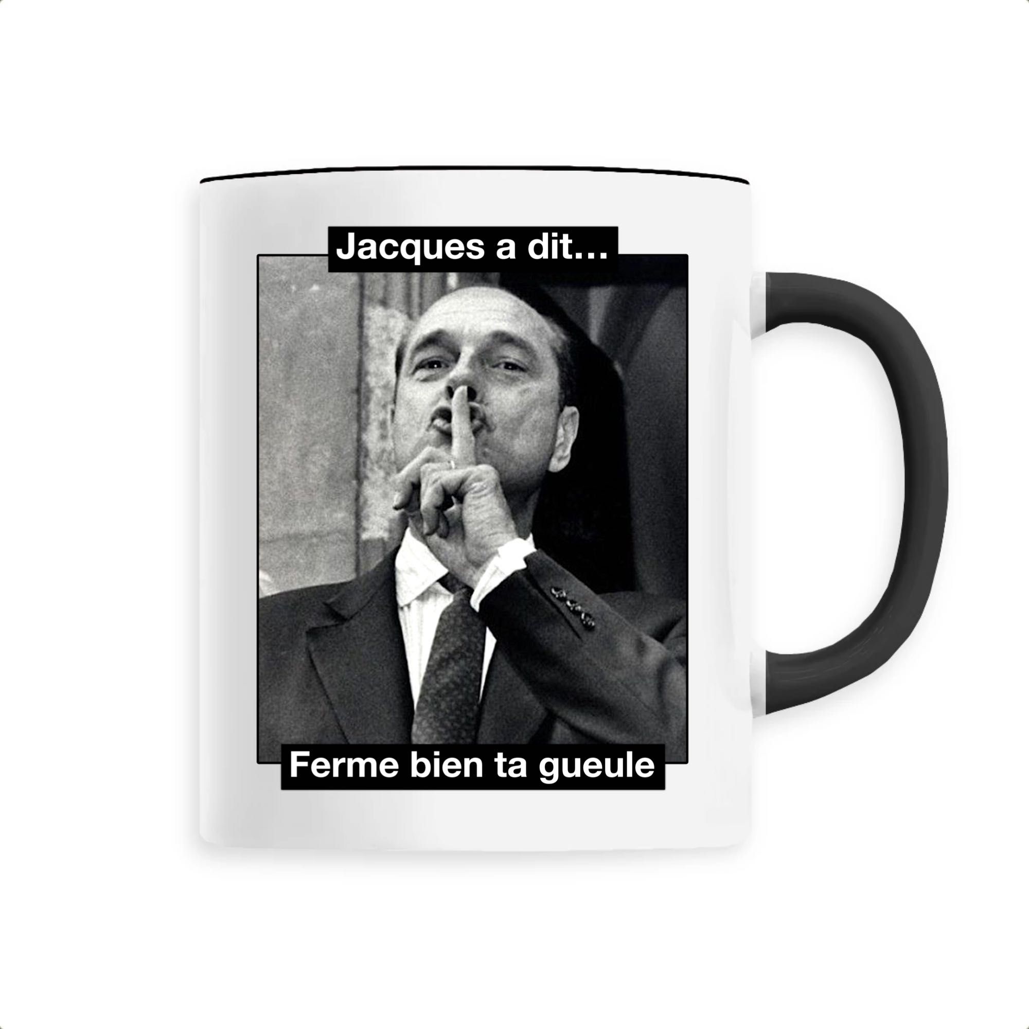 Mug original et décalé avec une célèbre photo de Chirac qui demande de se taire… Nous avons ajouté un petit coté fun et humoristique avec la phrase « Jacques a dit, ferme bien ta gueule« . C’est assez violent mais très efficace! Ce mug Chirac conviendra parfaitement pour un cadeau original, ou pour se faire plaisir et faire rire notre entourage! Efficacité garantie 🙂